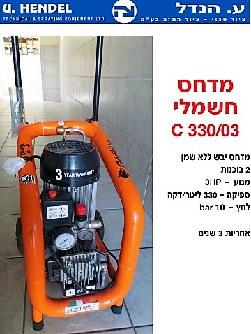 • מדחס יבש ללא שמן, 2 בוכנות. מנוע- 3HP , ספיקה - 330 ליטר/דקה. לחץ - 10bar. אחריות 3 שנים.